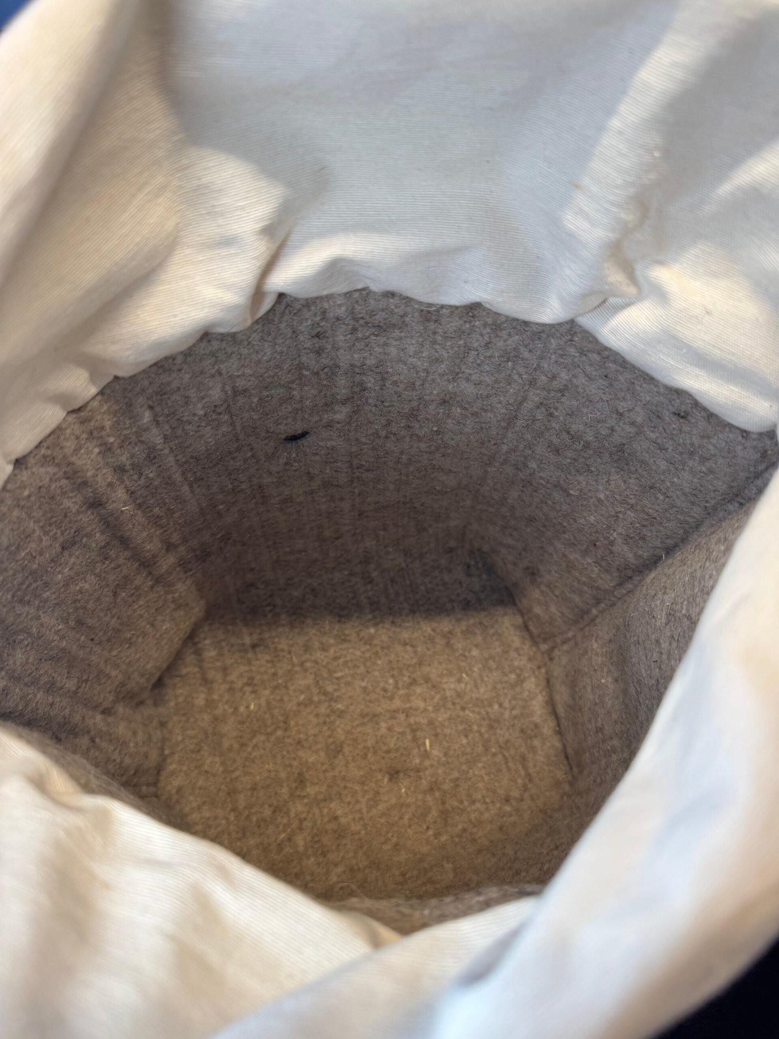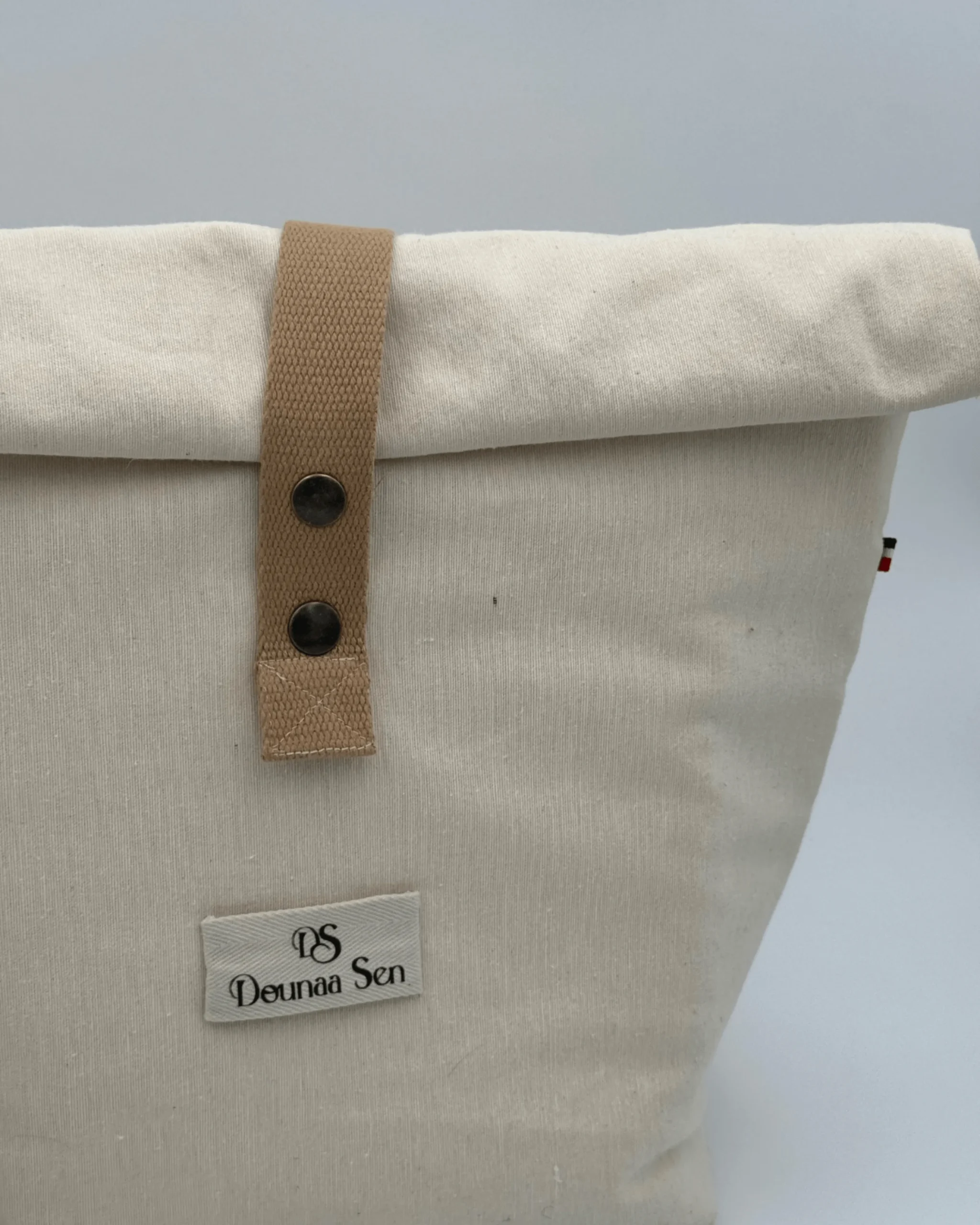 L’extérieur de nos sacs est conçu à partir de coton recyclé, composé à 70 % de fibres réutilisées. Ce choix reflète nos valeurs : réduire l’empreinte carbone, lutter contre le gaspillage textile et créer des produits durables.